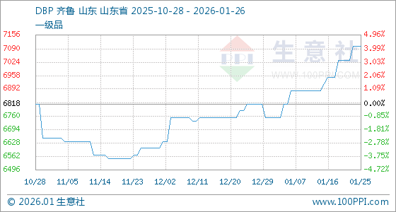 1月26日,生意社DBP基准价为7101.67元/吨,与本月初(6751.67元/吨)相比,上涨了5.18%。