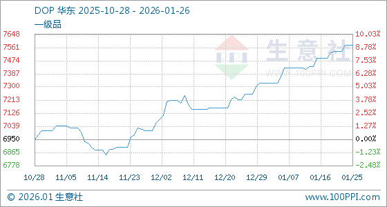 1月26日,生意社DOP基准价为7575.84元/吨,与本月初(7325.84元/吨)相比,上涨了3.41%。