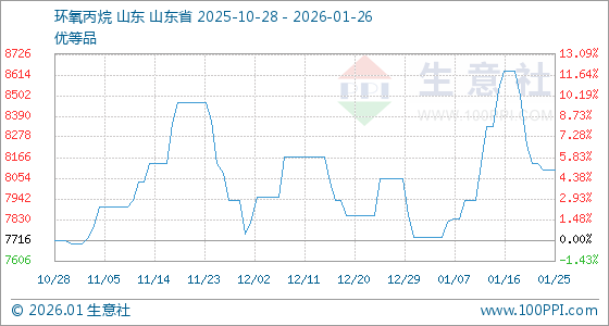 1月26日,生意社环氧丙烷基准价为8100.00元/吨,与本月初(7733.33元/吨)相比,上涨了4.74%。