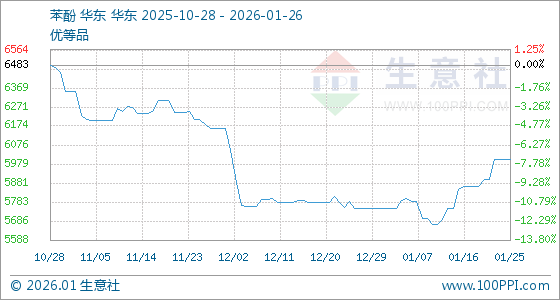 1月26日,生意社苯酚基准价为6000.00元/吨,与本月初(5750.00元/吨)相比,上涨了4.35%。