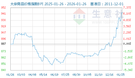 1月25日大宗商品价格指数BPI为943点, 与昨日持平 , 较周期内最高点1343点(2021-10-19)下降了29.78%,较2016年02月03日最低点660点上涨了42.88%。