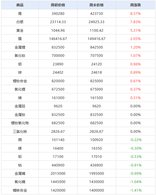 据生意社价格监测,2026年第03周(1.19-1.23)大宗商品价格涨跌榜中有色板块环比上升的商品共11种,其中涨幅5%以上的商品共3种,占该板块被监测商品数的13.6%;涨幅前3的商品分别为锡(8.57%)、白银(7.83%)、黄金(5.31%)。 环比下降的商品共有7种,跌幅前3的产品分别为镝铁合金(-1.41%)、氧化镝(-1.04%)、金属镝(-0.99%)。
