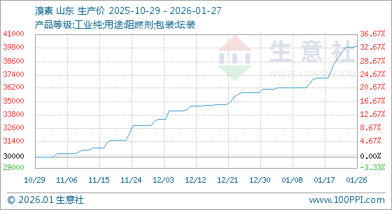 1月27日,生意社溴素基准价为40000.00元/吨,与本月初(36100.00元/吨)相比,上涨了10.80%。