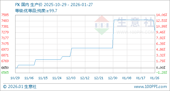 1月27日,生意社PX基准价为7300.00元/吨,与本月初(7500.00元/吨)相比,下降了2.67%。