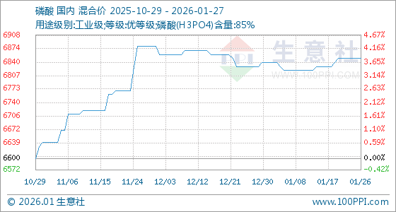 1月27日,生意社磷酸基准价为6850.00元/吨,与本月初(6840.00元/吨)相比,上涨了0.15%。