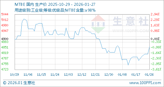 1月27日,生意社MTBE基准价为4856.67元/吨,与本月初(4823.33元/吨)相比,上涨了0.69%。