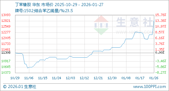 1月27日,生意社丁苯橡胶基准价为12866.67元/吨,与本月初(11575.00元/吨)相比,上涨了11.16%。