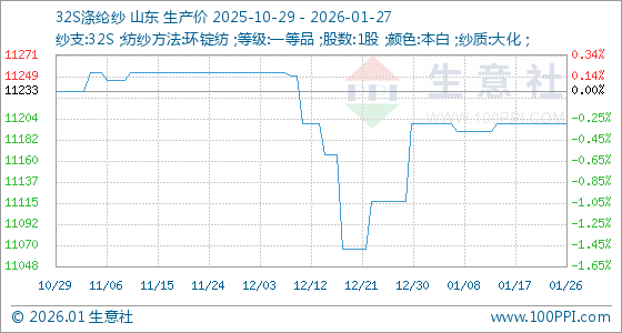 1月27日,生意社32S涤纶纱基准价为11200.00元/吨,与本月初持平。