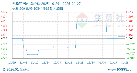 1月27日,生意社无缝管基准价为4084.00元/吨,与本月初(4112.00元/吨)相比,下降了0.68%。