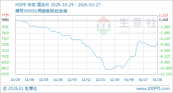 1月27日,生意社HDPE基准价为7265.00元/吨,与本月初(6862.50元/吨)相比,上涨了5.87%。