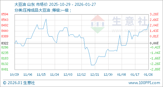 1月27日,生意社大豆油基准价为8508.00元/吨,与本月初(8256.00元/吨)相比,上涨了3.05%。