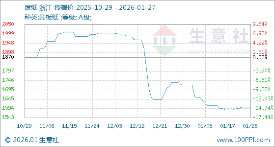 1月27日,生意社废纸基准价为1602.00元/吨,与本月初(1720.00元/吨)相比,下降了6.86%。