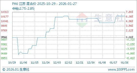 1月27日,生意社PA6基准价为10200.00元/吨,与本月初(10133.33元/吨)相比,上涨了0.66%。