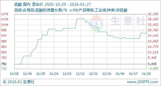 1月27日,生意社硫酸基准价为952.50元/吨,与本月初(937.50元/吨)相比,上涨了1.60%。