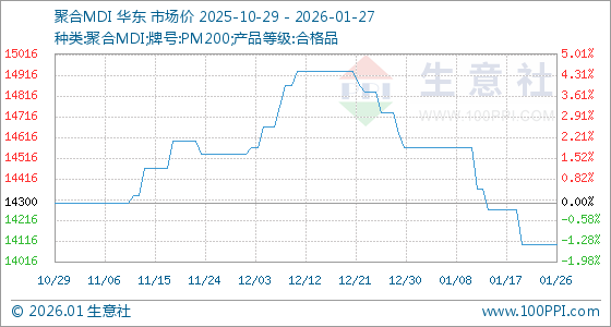 1月27日,生意社聚合MDI基准价为14100.00元/吨,与本月初(14566.67元/吨)相比,下降了3.2%。
