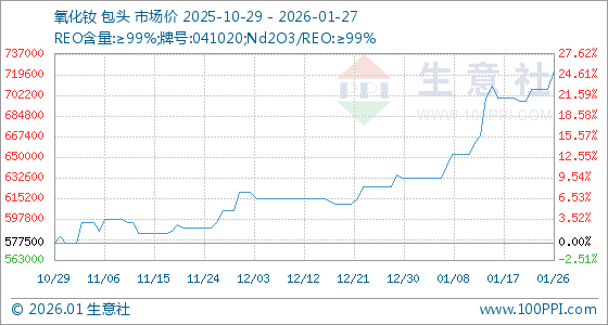 1月27日,生意社氧化钕基准价为722500.00元/吨,与本月初(632500.00元/吨)相比,上涨了14.23%。