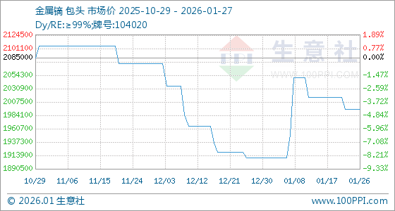 1月27日,生意社金属镝基准价为1995000.00元/吨,与本月初(1910000.00元/吨)相比,上涨了4.45%。