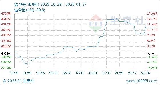 1月27日,生意社钴基准价为450800.00元/吨,与本月初(462100.00元/吨)相比,下降了2.45%。