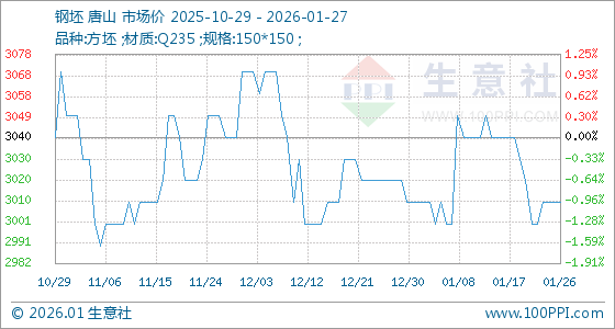 1月27日,生意社钢坯基准价为3010.00元/吨,与本月初持平。