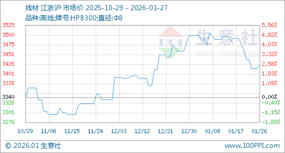1月27日,生意社线材基准价为3425.00元/吨,与本月初(3500.00元/吨)相比,下降了2.14%。