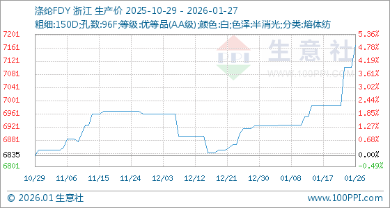 1月27日,生意社涤纶FDY基准价为7168.33元/吨,与本月初(6925.00元/吨)相比,上涨了3.51%。