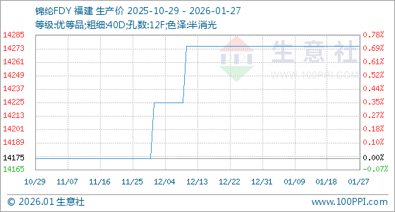 1月27日,生意社锦纶FDY基准价为14275.00元/吨,与本月初持平。