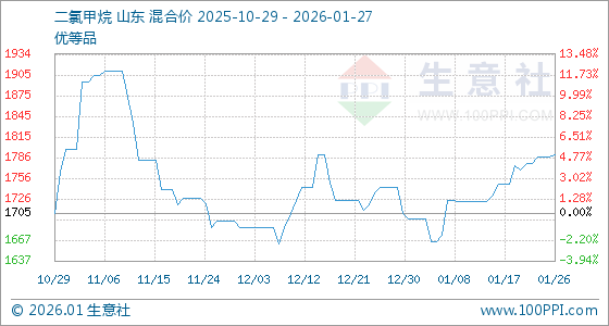 1月27日,生意社二氯甲烷基准价为1790.00元/吨,与本月初(1697.50元/吨)相比,上涨了5.45%。