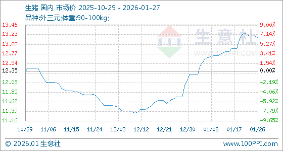 1月27日,生意社生猪基准价为13.17元/公斤,与本月初(12.28元/公斤)相比,上涨了7.25%。