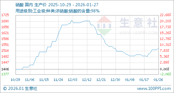 1月27日,生意社硝酸基准价为1533.33元/吨,与本月初(1513.33元/吨)相比,上涨了1.32%。
