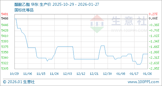 1月27日,生意社醋酸乙酯基准价为5353.33元/吨,与本月初(5346.67元/吨)相比,上涨了0.12%。