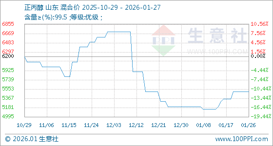 1月27日,生意社正丙醇基准价为5500.00元/吨,与本月初(5200.00元/吨)相比,上涨了5.77%。