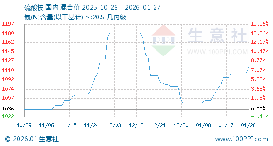 1月27日,生意社硫酸铵基准价为1118.33元/吨,与本月初(1046.67元/吨)相比,上涨了6.85%。