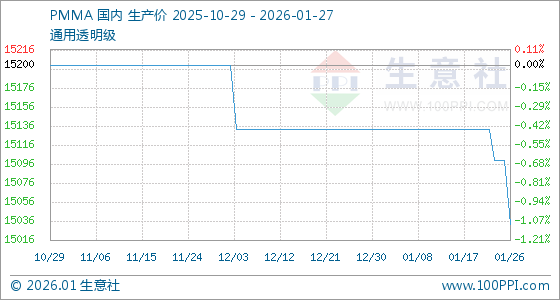 1月27日,生意社PMMA基准价为15033.33元/吨,与本月初(15133.33元/吨)相比,下降了0.66%。