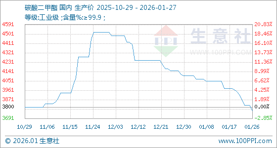1月27日,生意社碳酸二甲酯基准价为3766.67元/吨,与本月初(4100.00元/吨)相比,下降了8.13%。