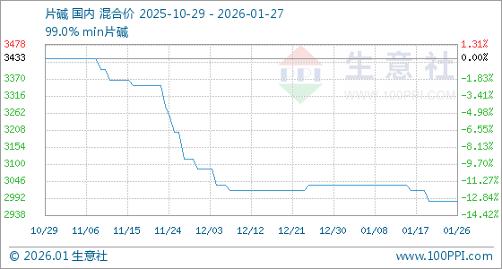 1月27日,生意社片碱基准价为2983.33元/吨,与本月初(3033.33元/吨)相比,下降了1.65%。