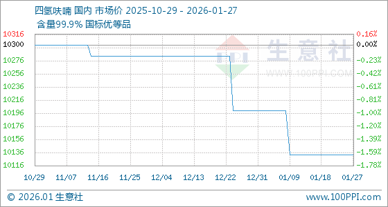 1月27日,生意社四氢呋喃基准价为10133.33元/吨,与本月初(10200.00元/吨)相比,下降了0.65%。