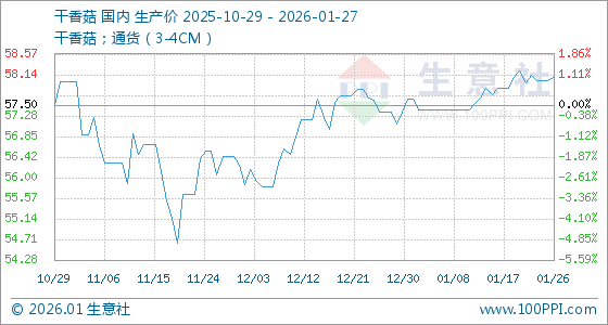 1月27日,生意社干香菇基准价为58.08元/公斤,与本月初(57.64元/公斤)相比,上涨了0.76%。