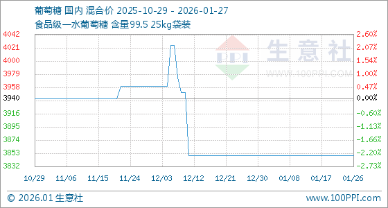1月27日,生意社葡萄糖基准价为3850.00元/吨,与本月初持平。