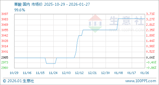 1月27日,生意社草酸基准价为3085.71元/吨,与本月初(3057.14元/吨)相比,上涨了0.93%。