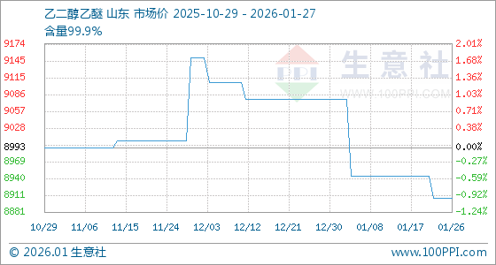 1月27日,生意社乙二醇乙醚基准价为8906.25元/吨,与本月初(9078.57元/吨)相比,下降了1.9%。