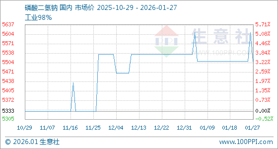1月27日,生意社磷酸二氢钠基准价为5610.00元/吨,与本月初(5533.33元/吨)相比,上涨了1.39%。