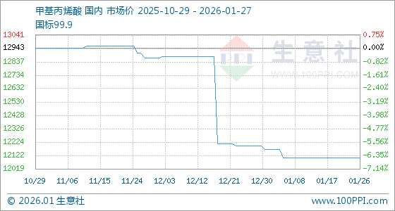 1月27日,生意社甲基丙烯酸基准价为12105.00元/吨,与本月初(12167.50元/吨)相比,下降了0.51%。
