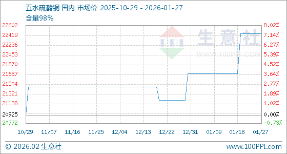 1月27日,生意社五水硫酸铜基准价为22450.00元/吨,与本月初(21700.00元/吨)相比,上涨了3.46%。