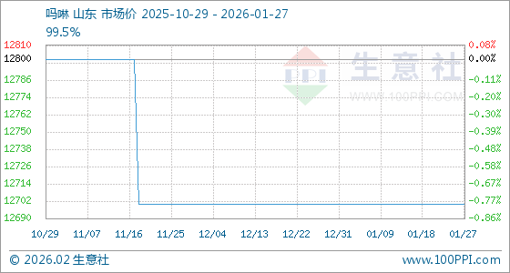 1月27日,生意社吗啉基准价为12700.00元/吨,与本月初持平。