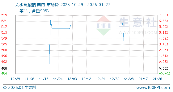 1月27日,生意社无水硫酸钠基准价为506.00元/吨,与本月初(520.00元/吨)相比,下降了2.69%。