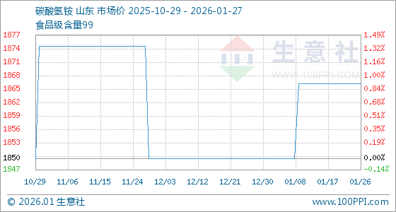 1月27日,生意社碳酸氢铵基准价为1866.67元/吨,与本月初(1850.00元/吨)相比,上涨了0.90%。