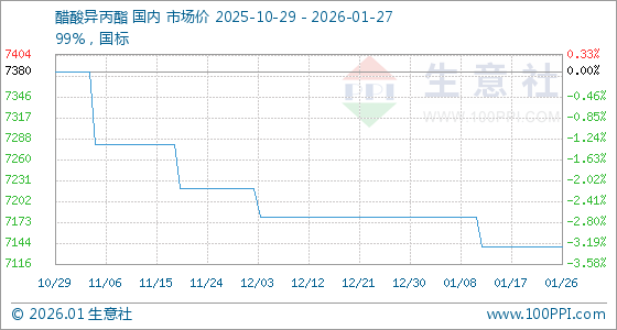 1月27日,生意社醋酸异丙酯基准价为7140.00元/吨,与本月初(7180.00元/吨)相比,下降了0.56%。