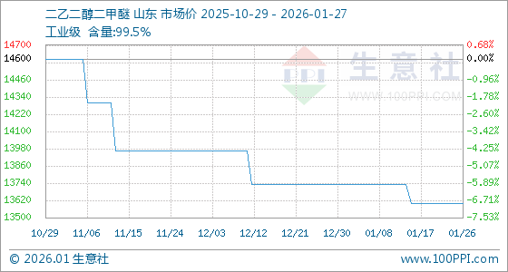 1月27日,生意社二乙二醇二甲醚基准价为13600.00元/吨,与本月初(13733.33元/吨)相比,下降了0.97%。
