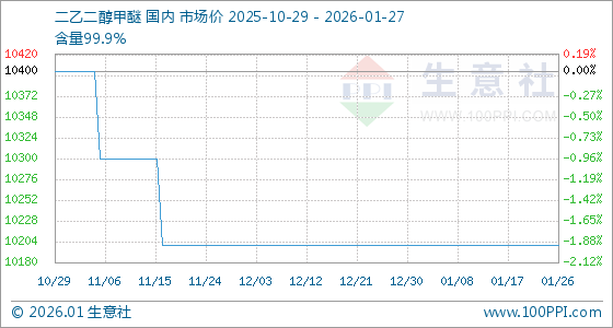1月27日,生意社二乙二醇甲醚基准价为10200.00元/吨,与本月初持平。
