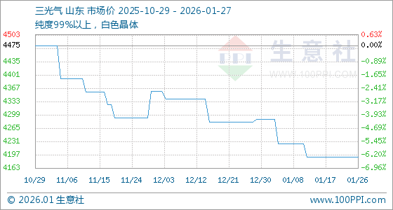 1月27日,生意社三光气基准价为4191.67元/吨,与本月初(4287.50元/吨)相比,下降了2.24%。